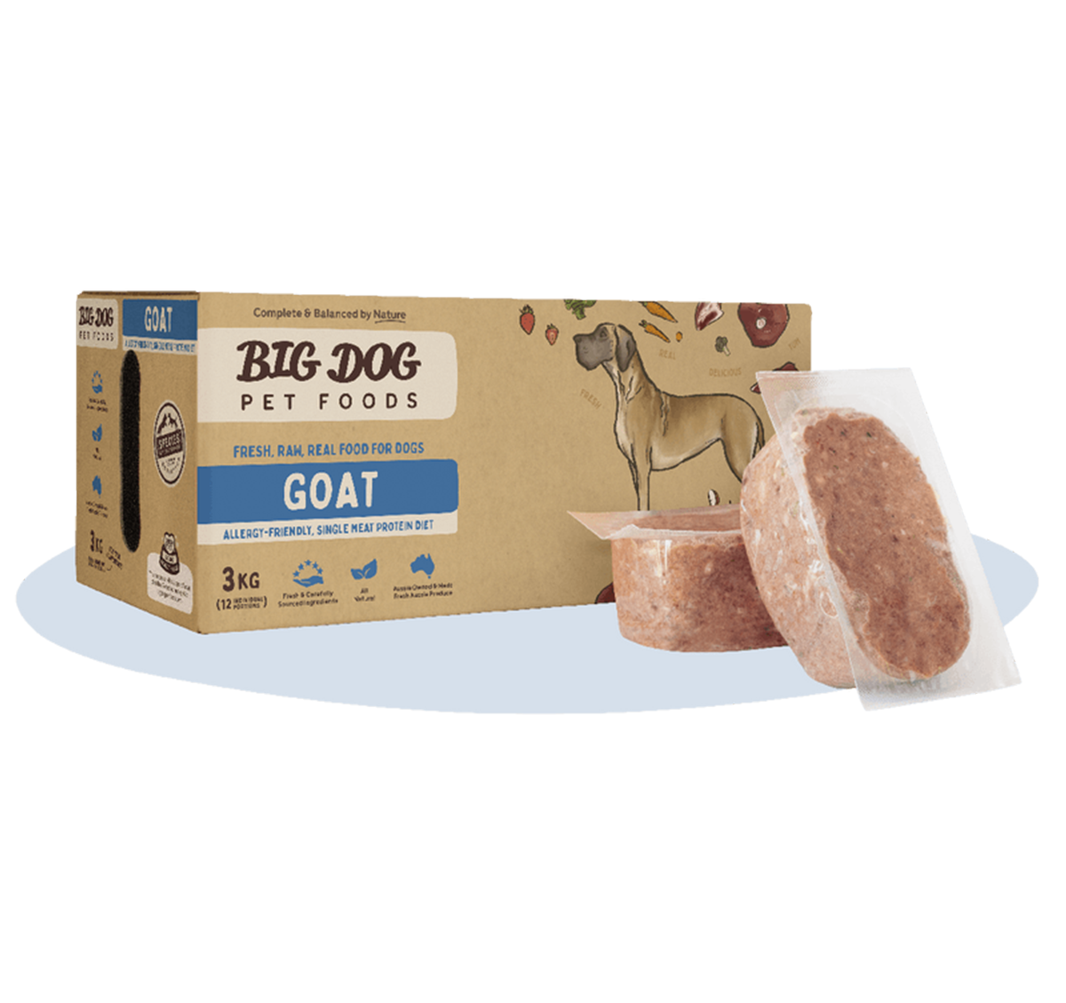 山羊(肉、心、磨碎的骨頭、氣管、胃、肝、腎、肺)、時令蔬菜水果包括但不限於(綠色香蕉、甘荀、豆角、西芹、西蘭花、青瓜、橙、蘋果、士多啤梨、藍莓)、小麥草、冷壓亞麻籽油、冷壓磨碎亞麻籽、白雲石、洋車前子、山羊乳清、海藻、有機富里酸