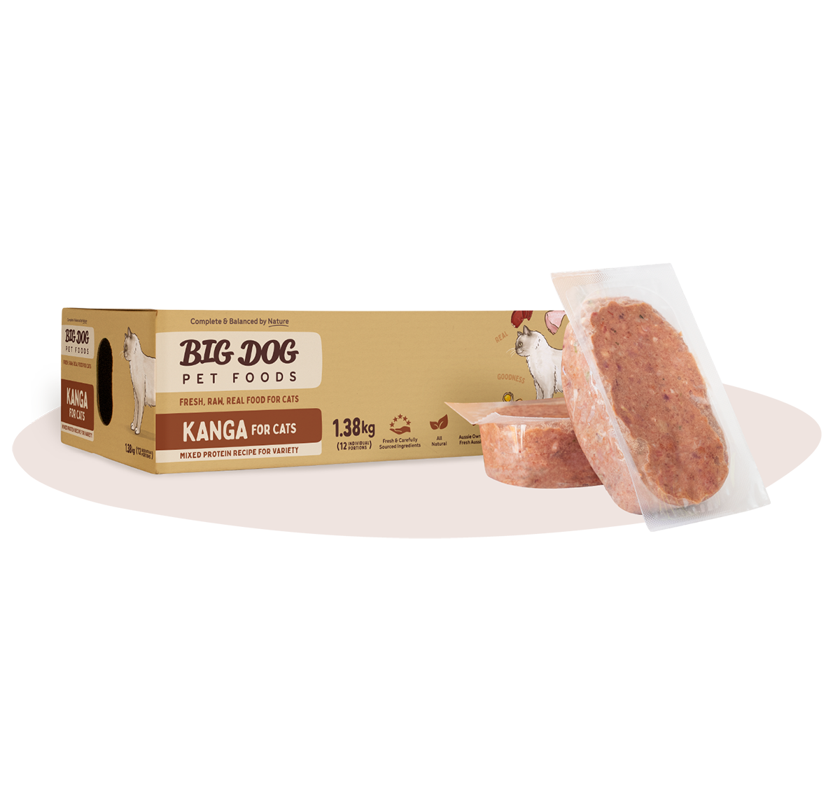 袋鼠(肉、磨碎的骨頭、心、肝、肺、氣管)、雞(肉、磨碎的骨頭)、牛肉、時令蔬菜水果(甘荀、豆角、西芹)、原隻雞蛋、小麥草、冷壓磨碎亞麻籽、山羊乳清、洋車前子、海藻、有機富里酸