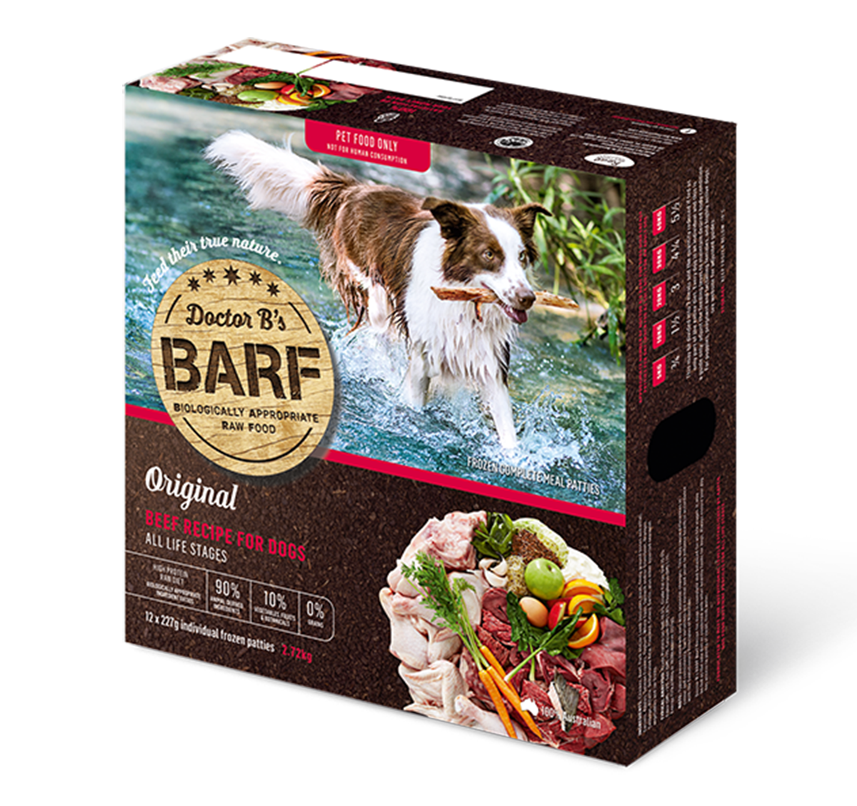 雞、牛、豬、羊(包括肉、細磨骨頭和內臟)、甘荀、蘋果、三文魚肉骨、乳酪、原隻蛋、菠菜、莙薘菜、橙、椰菜、紫花苜蓿、脫水海藻、亞麻籽、西芹、蒜頭、時令蔬菜及水果 |