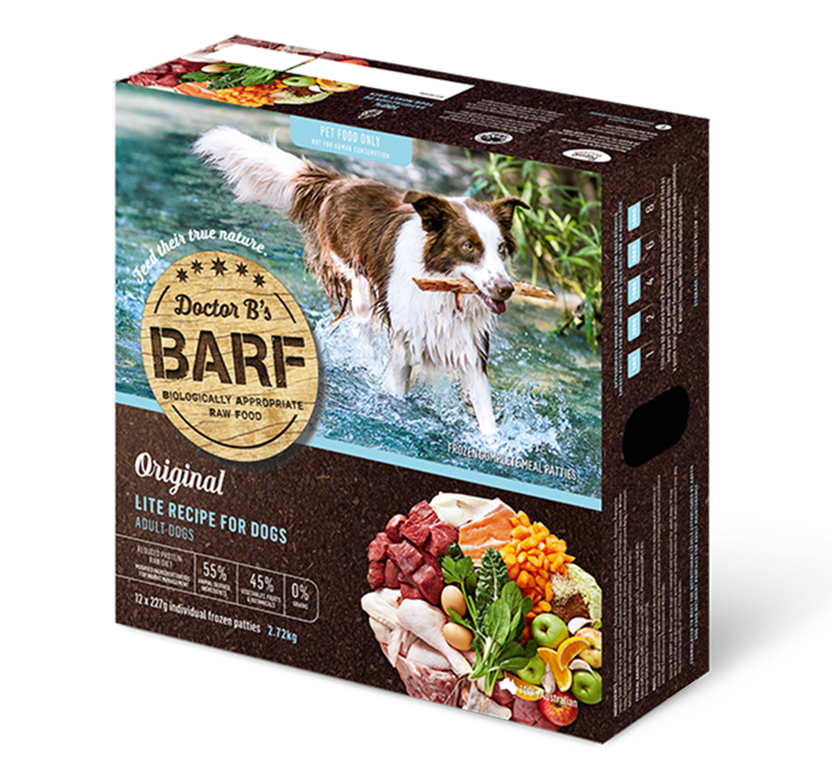 雞(包括肉、細磨骨頭和內臟)、甘荀、蘋果、袋鼠、牛、豬、羊(包括肉和內臟)、三文魚肉骨、亞麻籽、原隻蛋、菠菜、莙薘菜、乳酪、紫花苜蓿、橙、椰菜、脫水海藻、石灰石、西芹、蒜頭、時令蔬菜及水果 |