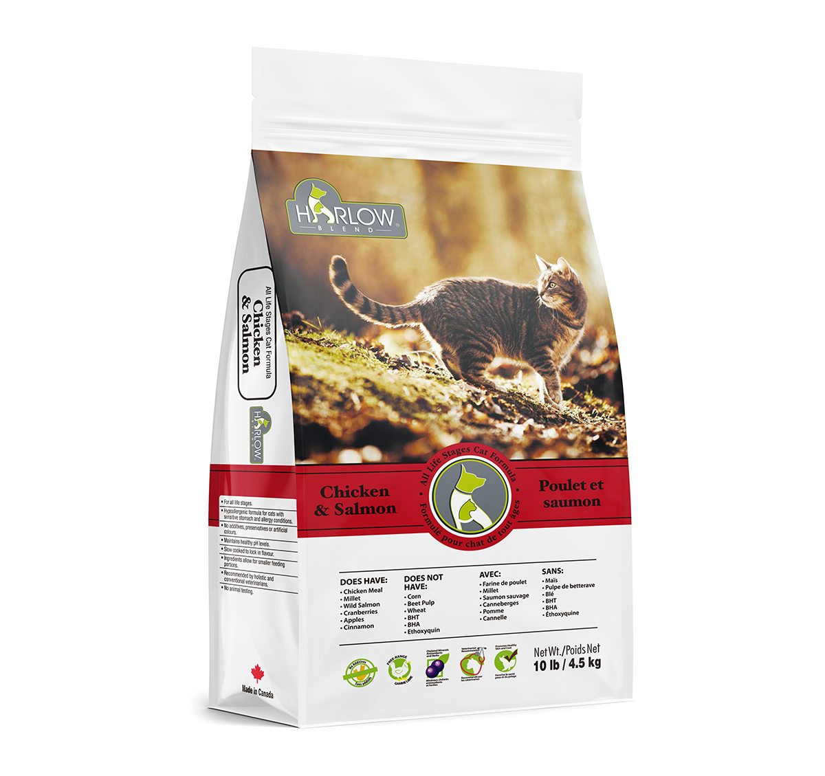 雞肉粉、全糙米、全大麥、雞脂肪**、磨碎的全亞麻籽、脫水雞肝、全小米、野生沙龍粉、脫水全蛋、牛磺酸、營養酵母、Dl-蛋氨酸、脫水蔓越莓、脫水蘋果、絲蘭提取物、迷迭香提取物、維生素:維生素E、L-抗壞血酸(維生素C來源) 、菸鹼酸、肌醇、維生素A補充劑、硝酸硫胺、核黃素、β-胡蘿蔔素、維生素D3、葉酸、D-泛酸鈣、鹽酸吡哆醇、D-生物素、維生素B12、礦物質:蛋白鋅、硫酸亞鐵、氧化鋅、蛋白鐵酸鈉、蛋白錳、碘酸錳鈣、氧化亞錳、碘酸錳鈣、鈣酸鈉 |