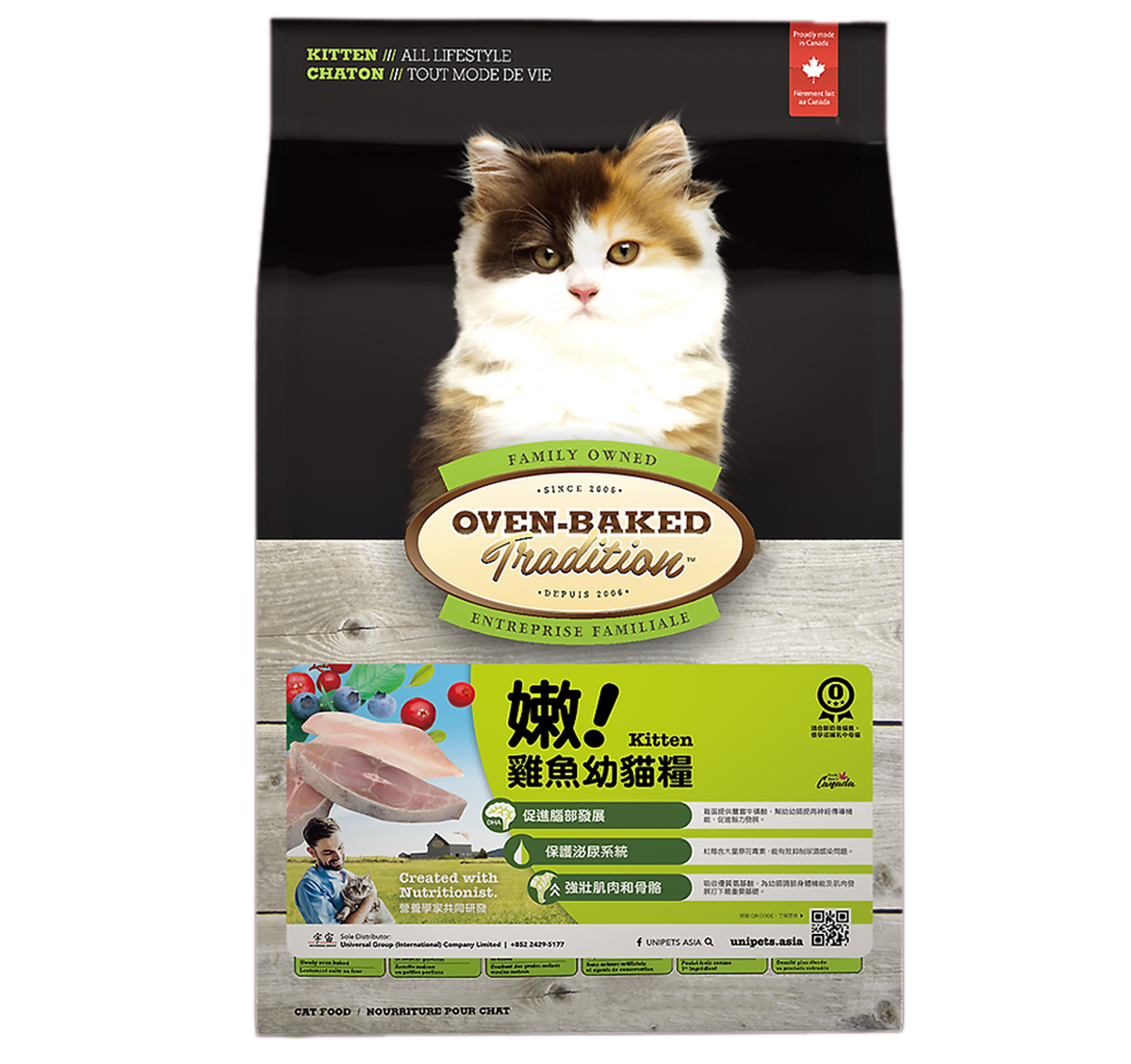 新鮮去骨雞肉、雞肉茸、研磨去殼大麥、研磨糙米、研磨原粒裸麥、新鮮雞肝、芥花籽油(以混合生育酚及檸檬酸保鮮)、天然香料、魚肉茸、啤酒酵母、南瓜、燕麥、研磨原粒亞麻籽、甜菜纖維、乾蛋製品、三文魚油、硫酸鈣、菊糖(益生元)、甜薯、蘋果、甘荀、菠菜、藍莓、海鹽、牛磺酸、小紅莓、菠蘿、氯化膽鹼、綠茶萃取物、蛋胺酸、硫酸鐵、硫酸鋅、維他命E補充劑、鹽酸鹽葡萄糖胺、硫酸軟骨素、洋芫茜、絲蘭萃取物、維他命B3補充劑、硫酸銅、維他命A補充劑、硫酸錳、維他命B1、D-泛酸鈣、維他命B6、生物素、維他命B2補充劑、維他命B12補充劑、維他命D3補充劑、碘酸鈣、葉酸、亞硝酸鈉、迷迭香萃取物(此產品可能含微量花生 |